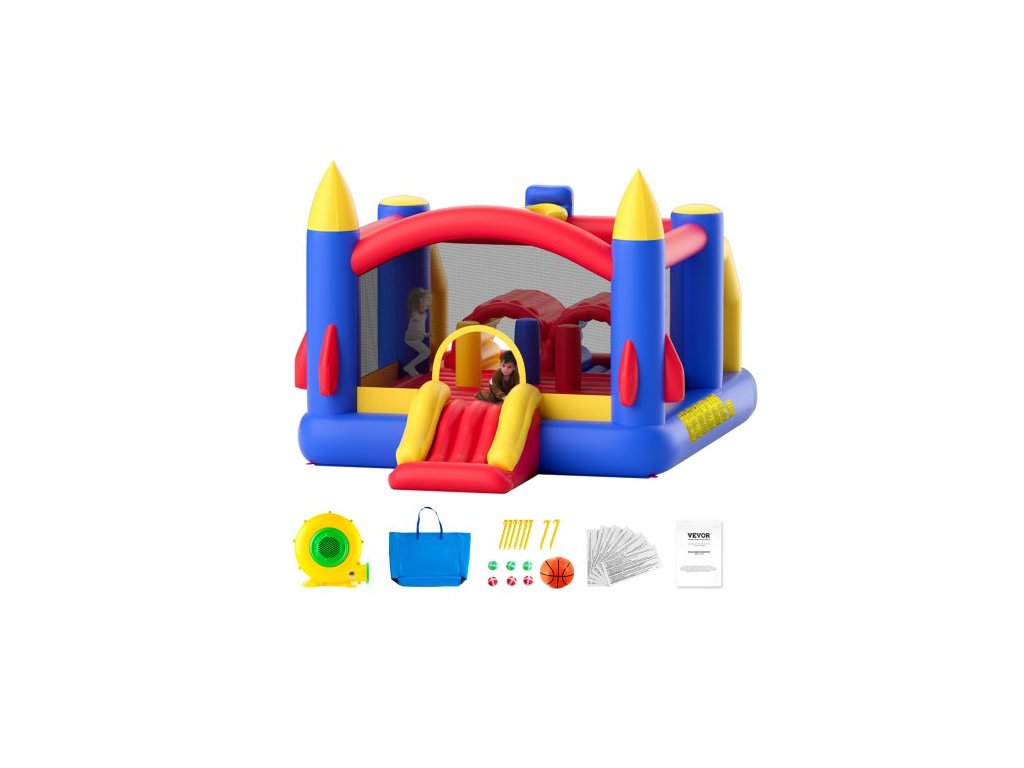 Nafukovací skákací hrad VEVOR, venkovní vysoce kvalitní trampolína, skákací hrací hrad s fukarem, skluzavkou a úložným vakem, rodinný skákací hrad na zahradu, pro děti ve věku 3–8 let, 160x94x96 palcůNejlepší dárek pro děti