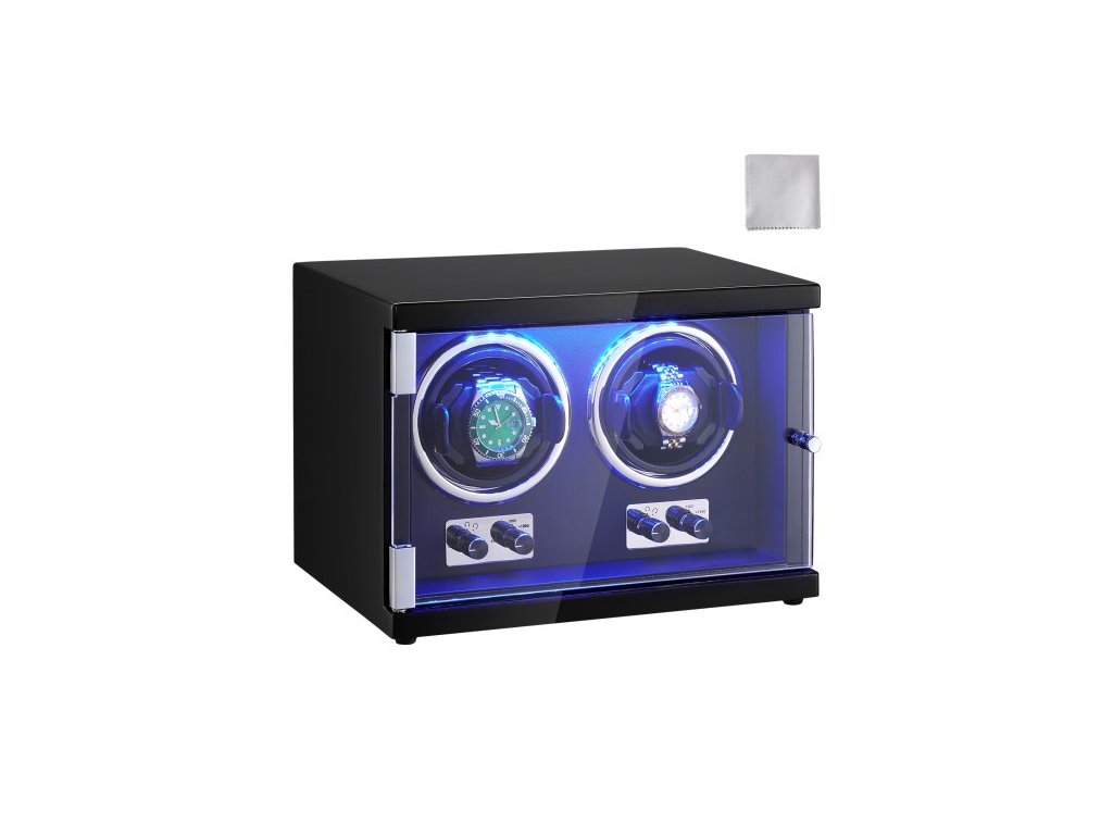 Natahovač hodinek VEVOR, duální natahovač hodinek pro pánské i dámské automatické hodinky, se 2 super tichými japonskými motory Mabuchi, modrým LED světlem a adaptérem, pouzdrem z vysoce husté desky a černým PU