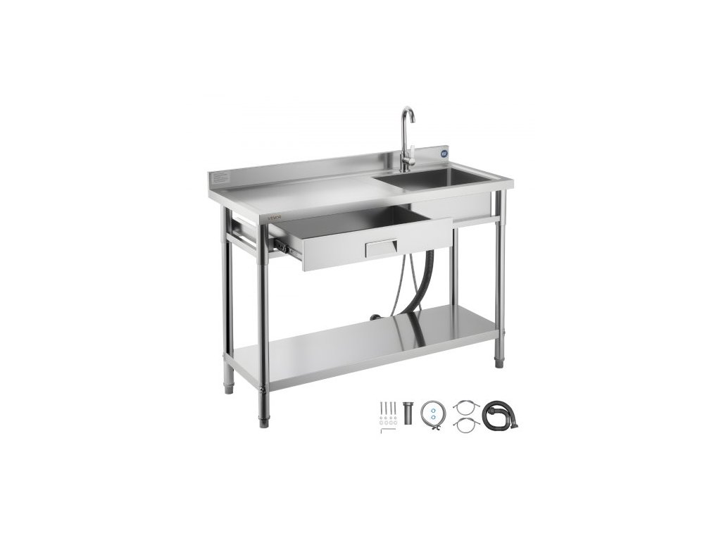 Nerezový kuchyňský dřez VEVOR, kolečkový dřez s jednou mísou a zásuvkou, kohoutkem a potrubím na teplou a studenou vodu, umyvadlo do garáže, restaurace, prádelny, 1200 x 500 x 940 mm