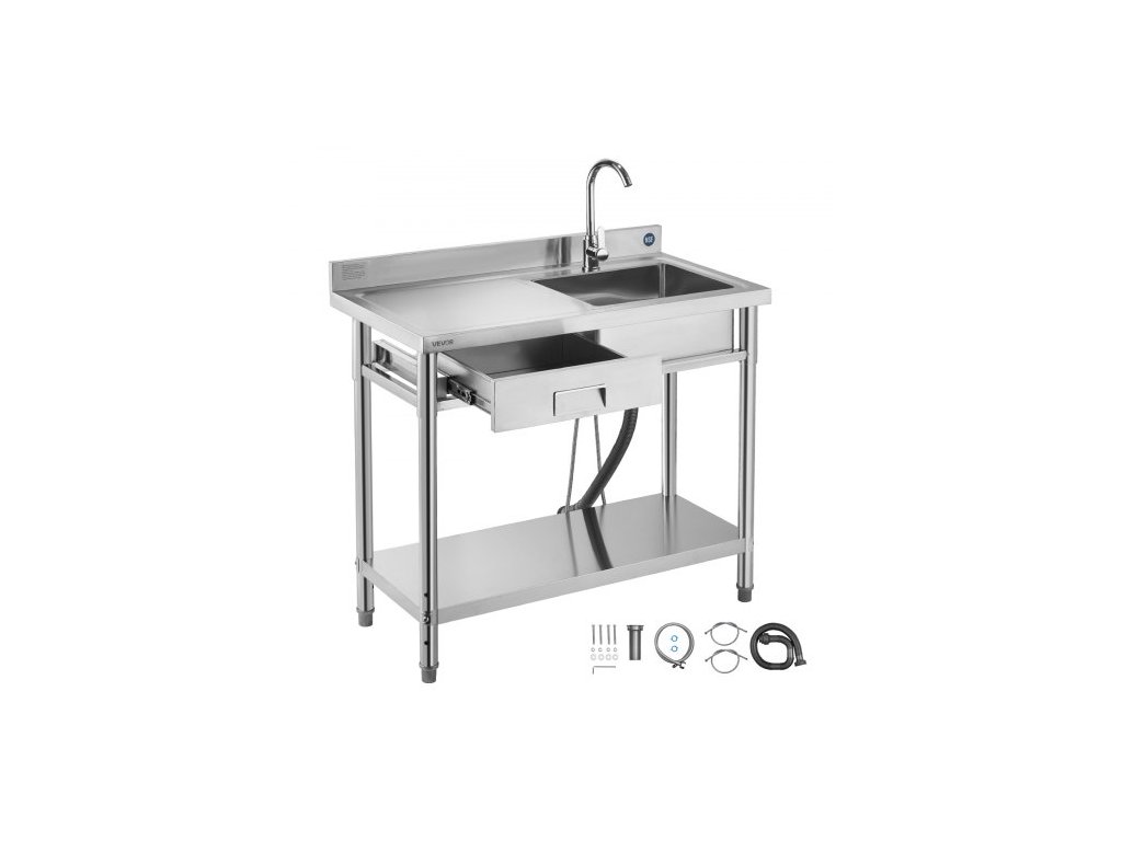 Nerezový kuchyňský dřez VEVOR, volně stojící, s jednou mísou, komerční, se zásuvkou, kohoutkem a přípojkou na teplou a studenou vodu, užitkové umyvadlo pro garážovou prádelnu, restauraci, 1000 x 500 x 940 mmStabilní a flexibilní