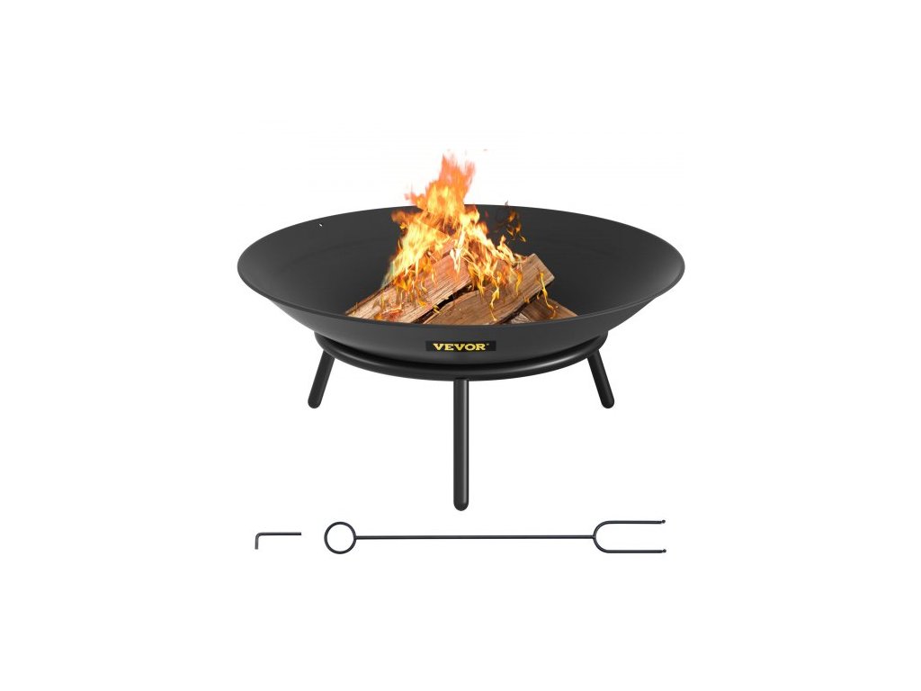 Ohniště VEVOR, kulaté ohniště z uhlíkové oceli o hloubce 22 palců, spalování dřeva pro venkovní terasy, zahrady a kempování, s odtokovým otvorem a tyčkou na palivové dřevo, černé