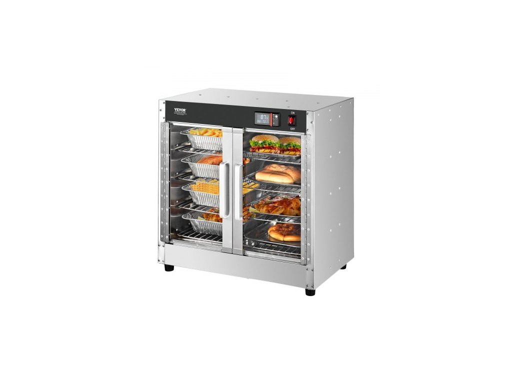 Ohřívač jídla VEVOR Hot Box, 4patrový ohřívač jídla s tácem na vodu, 4 pánve, dvoukřídlé skleněné dveře a nastavitelné police, nerezová ohřívací skříňka na jídlo, ideální pro skladování pizzy, kuřete, restauraceUdržujte jídlo teplé a čerstvé
