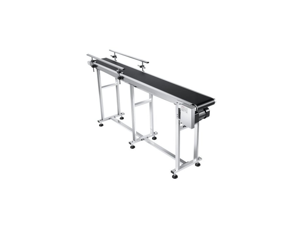 Pásový dopravník VEVOR, dopravníkový stůl 71 x 7,8 palce, vysoce odolný motorizovaný pásový dopravník z nerezové oceli pro aplikace inkoustového kódování, poháněný PVC pás, antistatická nastavitelná rychlost (dvojité zábradlí)