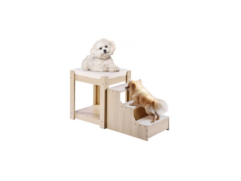 Patrová postel VEVOR pro domácí mazlíčky se schody, okenní bidýlko pro psy/kočky, víceúrovňová postel s okenním bidýlkem a nočním stolkem pro psy, vyvýšená plošina s pěnovým polštářem, pohovka s pelíškem pro použití u postele v interiéru (béžová)Multifunkční pelíšek pro domácí mazlíčky