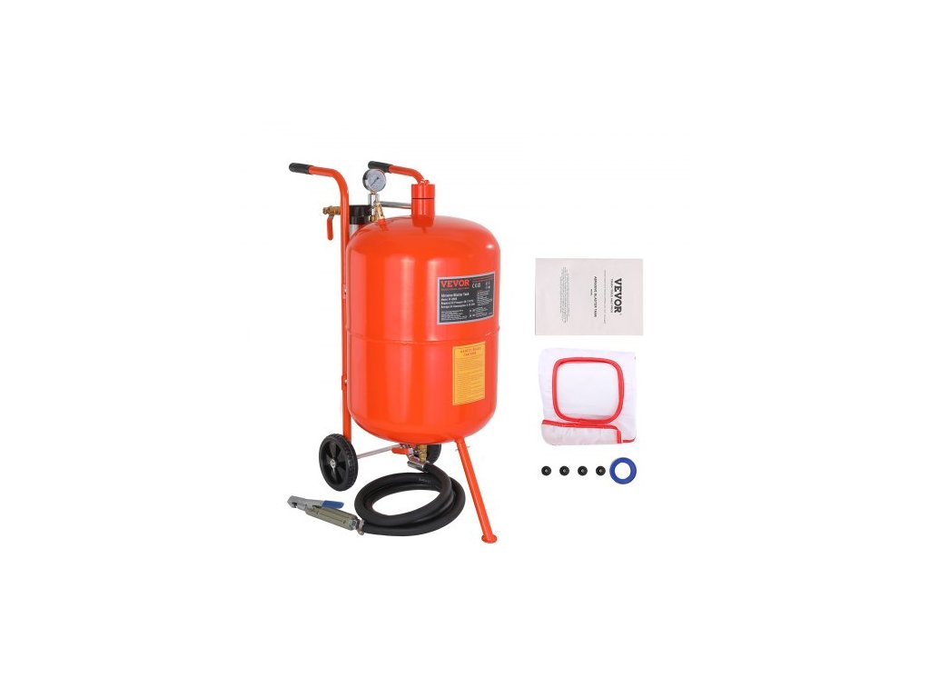 Rozměry produktu: 750 x 395 x 835 mm, Odlučovač oleje a vody: Ano, Hmotnost produktu: 18,12 kg, Provozní tlak: 60 - 110 PSI, Velikost kola: Ø5,9" x 1,2" / Ø150 x 31,5 mm, Doporučená abrazivní kapacita: 8,7 galonu / 33 l,Číslo modelu položky: FF-Q903, Použitelné brusivo: zrnitost 60-100, Objem nádrže: 20 galonů / 75,7 l