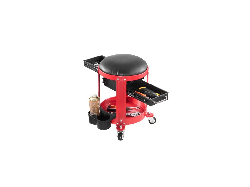 Pojízdná mechanická stolička VEVOR s kolečky, nosnost 136 kg, polstrované kolečkové sedadlo s pevnou výškou, odkládací plocha na nářadí a 2 zásuvky, do garáže, dílny a autoservisu, červená + černá