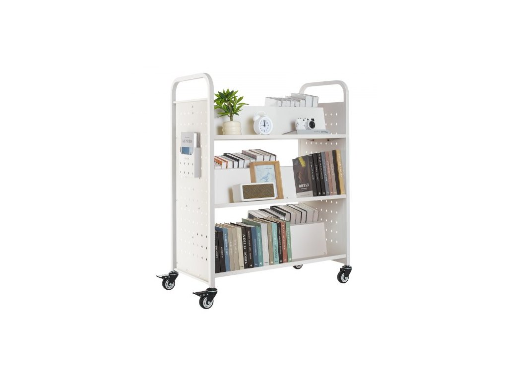 Pojízdný knihovní vozík VEVOR, nosnost 150 kg, 97 x 51,5 x 122,5 cm, oboustranné police ve tvaru W s uzamykatelnými kolečky 76,2 mm, knihoven do domácnosti, kanceláře a školy, bílýMultifunkční knižní vozík 3 v 1