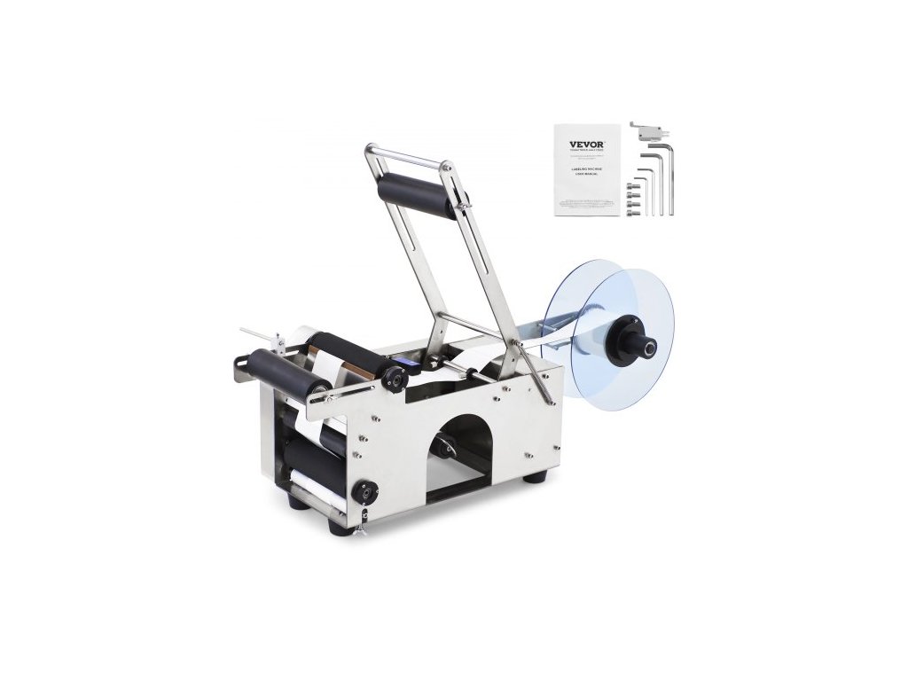 Poloautomatický etiketovací stroj VEVOR na kulaté lahve, 20–50 ks/min, elektrický aplikátor etiket na kulaté lahve, etiketovací stroj na kulaté lahve vhodný pro průměr lahví 0,79–4,72 palce (s přítlačnou lištou)