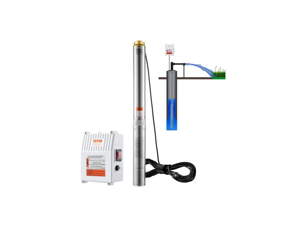 Ponorné čerpadlo VEVOR do hlubinných vrtů, 1500 W 230 V 60 Hz, průtok 9,8 m³/h, výška 108 m, s kabelem 19,4 m a externí ovládací jednotkou, nerezová vodní čerpadla pro průmyslové, zavlažovací a domácí použití, vodotěsné IP68