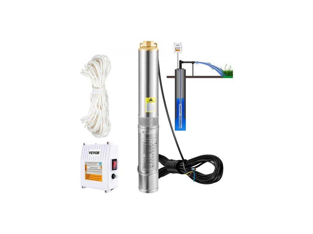 Ponorné čerpadlo VEVOR do hlubinných vrtů, 370 W 230 V/50 Hz, 110 l/min, dopravní výška 44 m, s 20m kabelem a externí ovládací jednotkou, 10,2 cm nerezová vodní čerpadla pro průmyslové, zavlažovací a domácí použití, vodotěsné IP68
