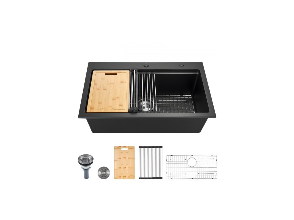 Pracovní stanice VEVOR 84 cm s kuchyňským dřezem, žulové dřezy s horní montáží, vestavné jednodřezové umyvadlo ve venkovském stylu s mnoha doplňky, dřez do myčky nádobí pro karavan, kuchyň a bar (černá)