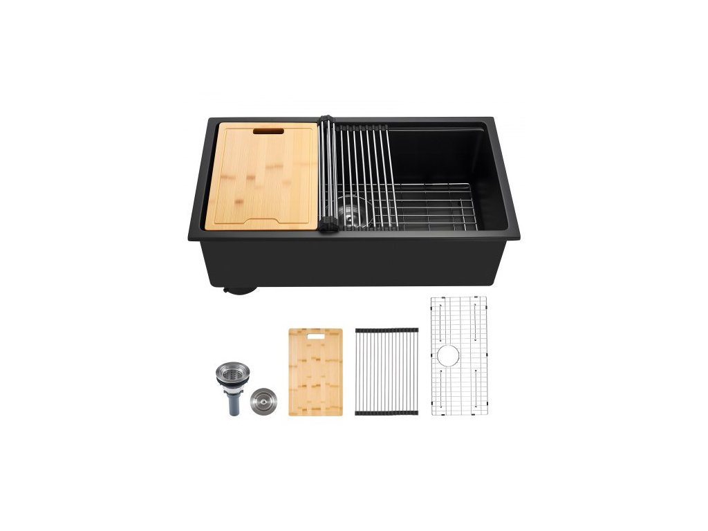 Pracovní stanice VEVOR s kuchyňským dřezem 76 cm, podstavný žulový dřez, vestavné jednodřezové umyvadlo ve venkovském stylu s mnoha doplňky, dřezy do myčky nádobí pro karavany, přípravné kuchyně a bary (černá)Styl pod montáž