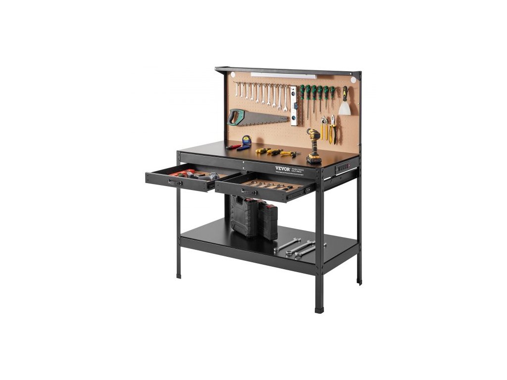 Pracovní stůl VEVOR, ocelový pracovní stůl A3 do garáže, max. 1500 W, vysoce odolný pracovní stůl, nosnost 100 kg, tloušťka desky stolu 1,2 cm, tloušťka desky stolu, dřevěný pracovní stůl, kabel 1,5 m, 4x AC zásuvky, 2x USB porty, 30x háčky