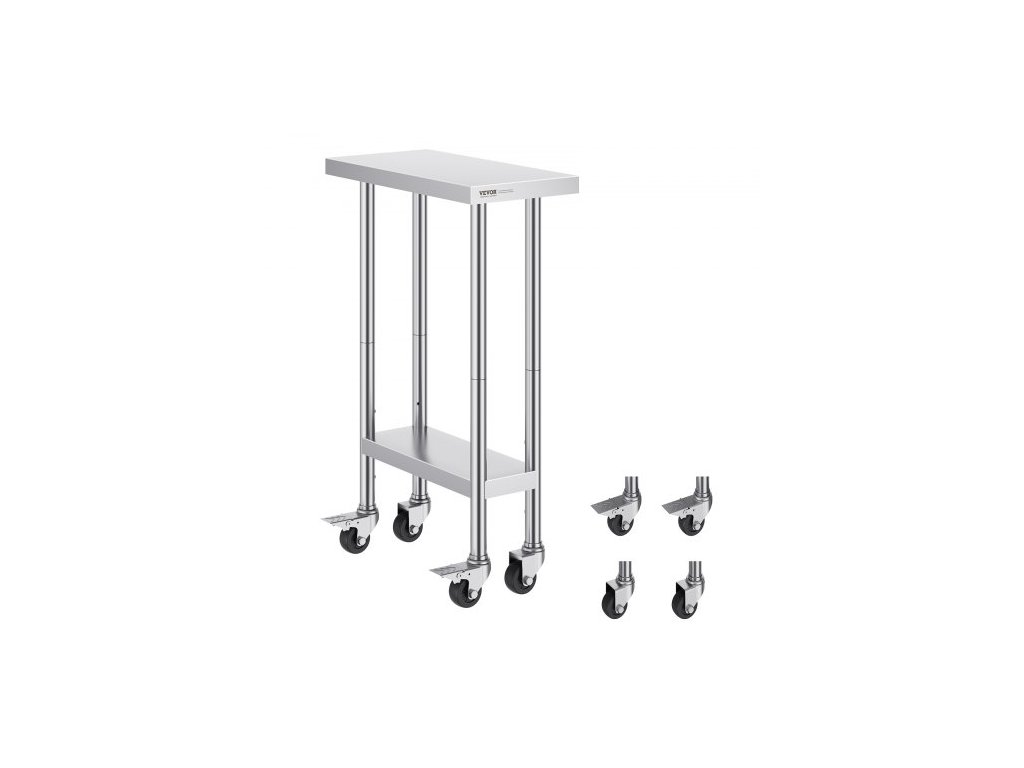 Pracovní stůl VEVOR z nerezové oceli 24 x 12 x 38 palců, se 4 kolečky, 3 nastavitelné výšky, odolný pracovní stůl na přípravu jídla do komerční kuchyně, stříbrnýStylový pracovní stůl