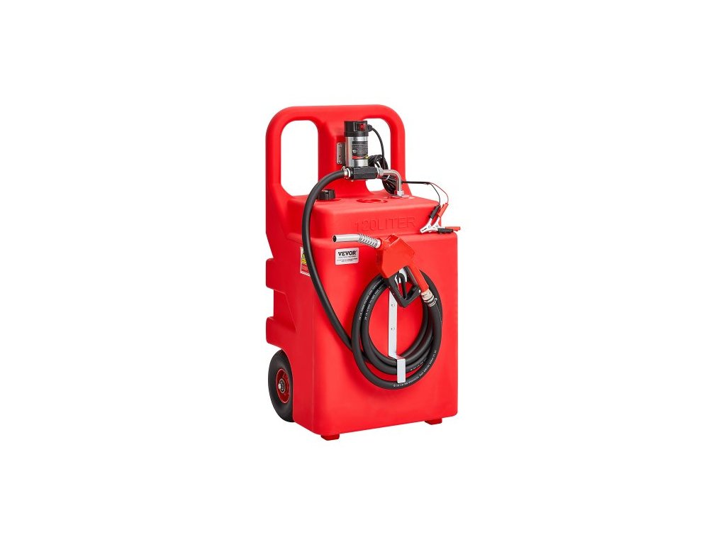 Přenosná nádrž na naftu VEVOR, 32 galonů, přenosná nádrž na petrolej s elektrickým čerpadlem 12 V DC 10 GPM, 13 stop dlouhou výdejní hadicí a samotěsnicí tryskou, kompatibilní s naftou a petrolejemObjem 32 galonů