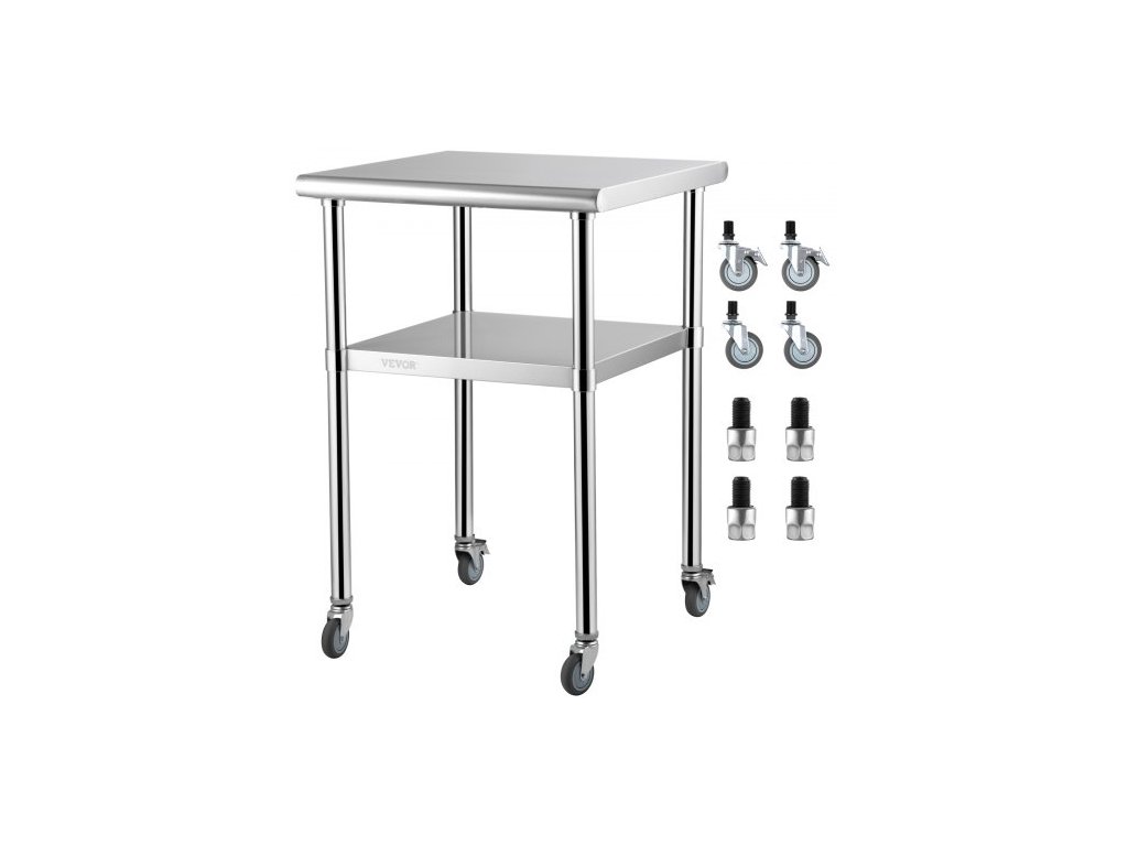 Přípravný stůl VEVOR z nerezové oceli, 24 x 24 x 36 palců, nosnost 600 liber Kovový pracovní stůl pro velké zatížení s nastavitelnou spodní poličkou a univerzálními kolečky, komerční pracovní stanice pro kuchyňskou garáž na dvorkuVysoce kvalitní nerezová ocel