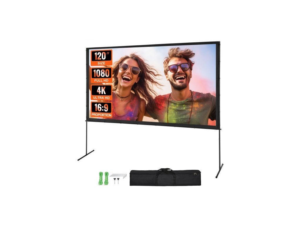 Projekční plátno VEVOR se stojanem, 120 palců 16:9 4K 1080 HD venkovní filmové plátno se stojanem, projekční plátno bez vrásek s nožičkami a přepravní taškou, pro domácí kino, filmový večer na zahradě