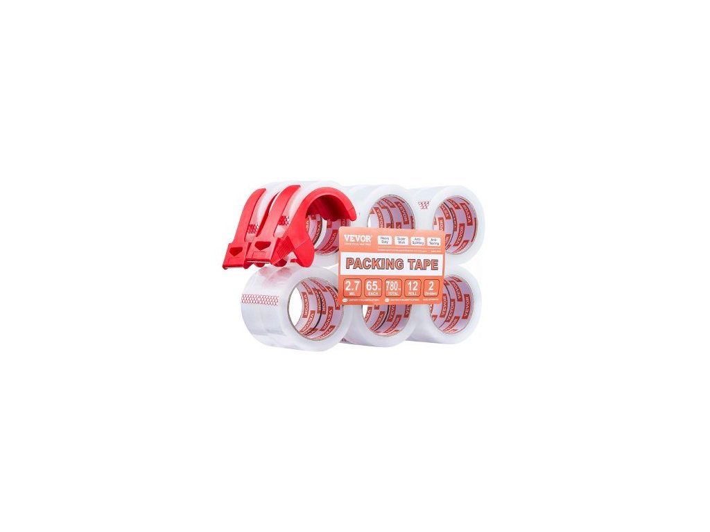 Průhledná balicí páska VEVOR, jádro 3 palce, 12 rolí 1,88 palce x 65 yardů, balicí páska s dávkovačem, silná balicí páska o tloušťce 2,7 mil, určená pro stěhování, skladování a balení, přepravu a zasílání poštouProfesionální balicí páska