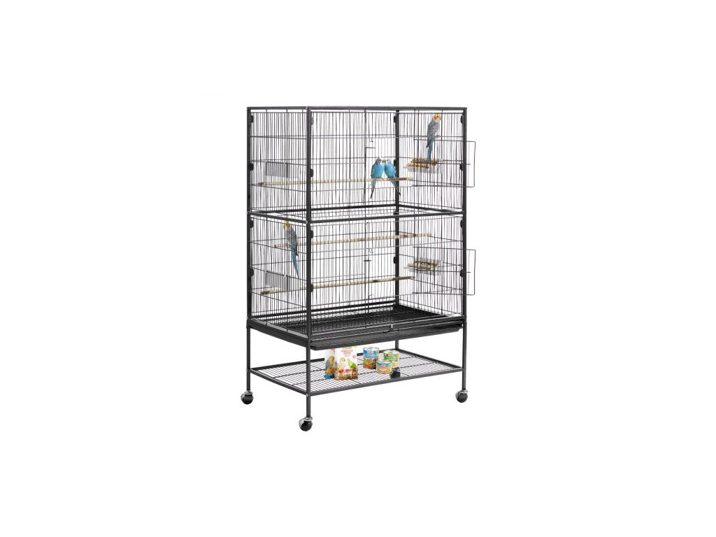 Ptačí klec VEVOR, 800 x 520 x 1320 mm, plochá střecha, kovaná železná ptačí klec s bidýlky, výsuvným tácem a plastovými krmítky, kolečka, pro papoušky, sýkory modřinky, korely, kanáry a andulky mnichové.
