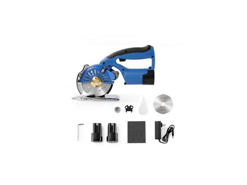 Řezačka látek VEVOR, 5stupňová akumulátorová elektrická rotační řezačka látek, tloušťka řezu 1,1", osmihranný nůž, s náhradní čepelí a nabíječkou baterií, pro vícevrstvé látky, kůže a textilie