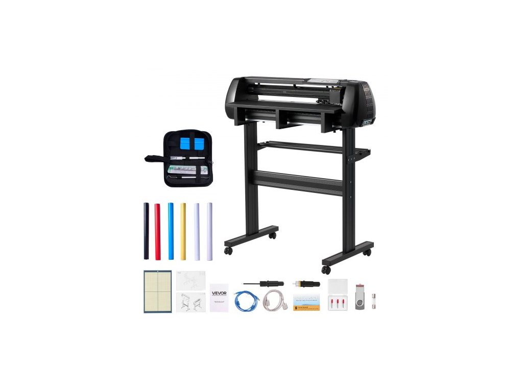 Řezačka vinylu VEVOR, maximální šířka podávání 720 mm, dva nože, nastavitelná síla a rychlost, LED displej, sada pro řezání vinylu s archy samolepek, transferová fólie, software Signmaster