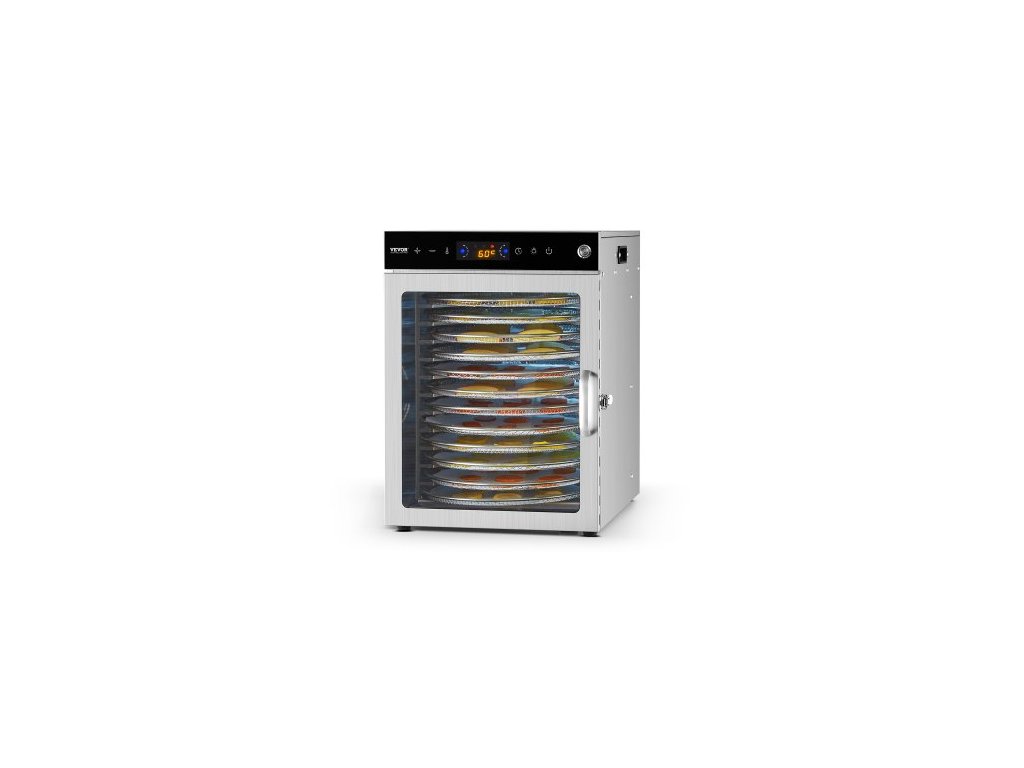 Rotační sušička potravin VEVOR, 12 nerezových táců, elektrická sušička potravin o výkonu 800 W s nastavitelnou teplotou a 24hodinovým časovačem, lyofilizátor na sušené maso, maso, ovoce, zeleninu, bylinky a psí pamlsky