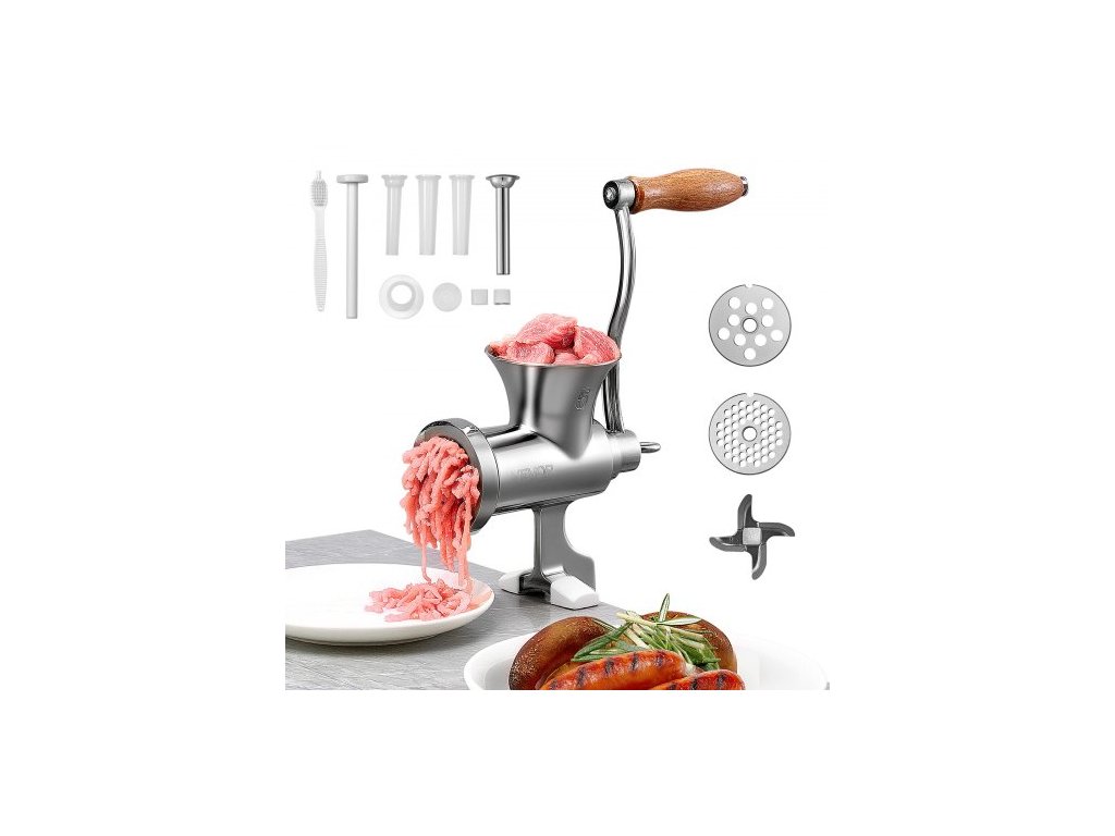 Ruční mlýnek na maso VEVOR, ruční mlýnek na maso z nerezové oceli 304 s ocelovou stolní svorkou, plnička klobás se 2 řeznými deskami a 4 trubičkami na klobásy, mlýnek na hovězí, chilli a vepřové maso, kuchyňský stůlStabilní stolní svorka