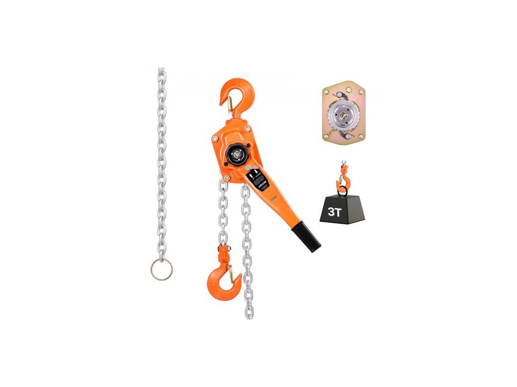 Ruční pákový řetězový kladkostroj VEVOR, nosnost 3T 3000KG, pro vysoké zatížení, řetěz z legované oceli 3M Lift G80 s dvojitou západkovou mechanickou brzdou, háky otočné o 360°, pro sklady, stavby, garáže
