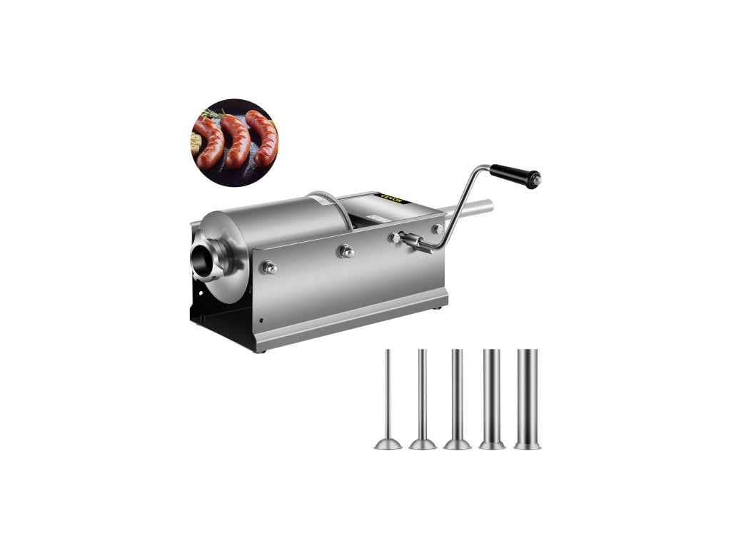 Ruční plnička klobás VEVOR, horizontální stroj na klobásy o objemu 3 l / 7 liber, dvourychlostní plnička masa, vyrobeno z potravinářské nerezové oceli 304, obsahuje 5 plnicích trubic, pro domácí kuchyni, restauraci a komerční účelyManuální horizontální plnička klobás