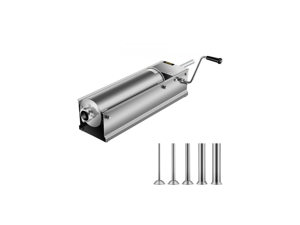 Ruční plnička klobás VEVOR, horizontální stroj na klobásy o objemu 7 l / 15 liber, dvourychlostní plnička masa, vyrobeno z potravinářské nerezové oceli 304, obsahuje 5 plnicích trubek, pro domácí kuchyni, restauraci, obchodManuální horizontální plnička klobás