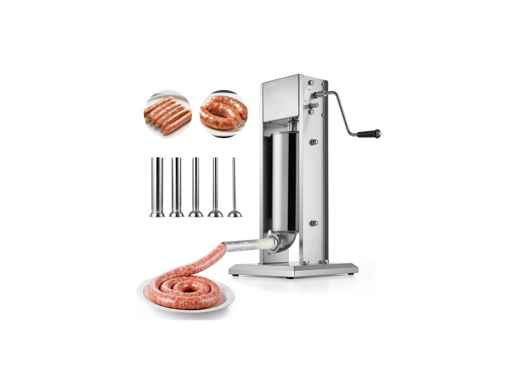 Ruční plnička klobás VEVOR, vertikální plnička masa 11 LBS / 5 L, dvourychlostní plnička masa do klobásových střívek, nerezová plnička s 5 plnicími trubicemi, pro komerční i domácí použitíBoční panely z nerezové oceli