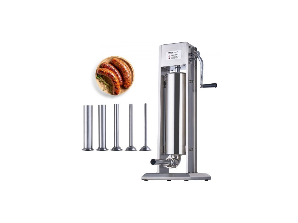 Ruční plnička klobás VEVOR, vertikální stroj na klobásy o objemu 7 l / 15 liber, dvourychlostní plnička masa, vyrobeno z potravinářské nerezové oceli 304, obsahuje 5 plnicích trubic, pro domácí kuchyni, restauraci a komerční účely
