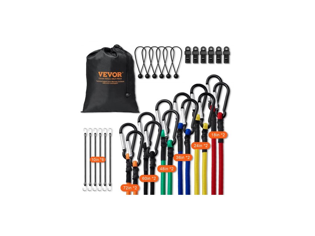 Sada 30 bungee popruhů VEVOR, 8mm odolné bungee popruhy s ocelovými karabinami A3, obsahuje přenosnou úložnou tašku 25 cm, 45 cm, 60 cm, 122 cm, 152 cm a úchyty na stříšku.
