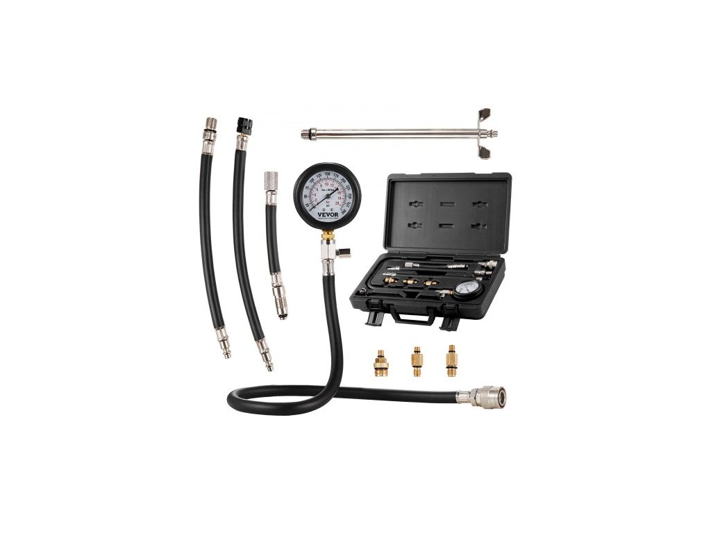 Sada adaptérů pro kompresní tester VEVOR, 9dílná sada pro testování úniku komprese z válců automobilového motoru, přesný manometr s dvojitou stupnicí 0-300 psi, s hadicemi s dlouhým dosahem a pouzdrem pro válce motoruDvoustupňové tlakoměry