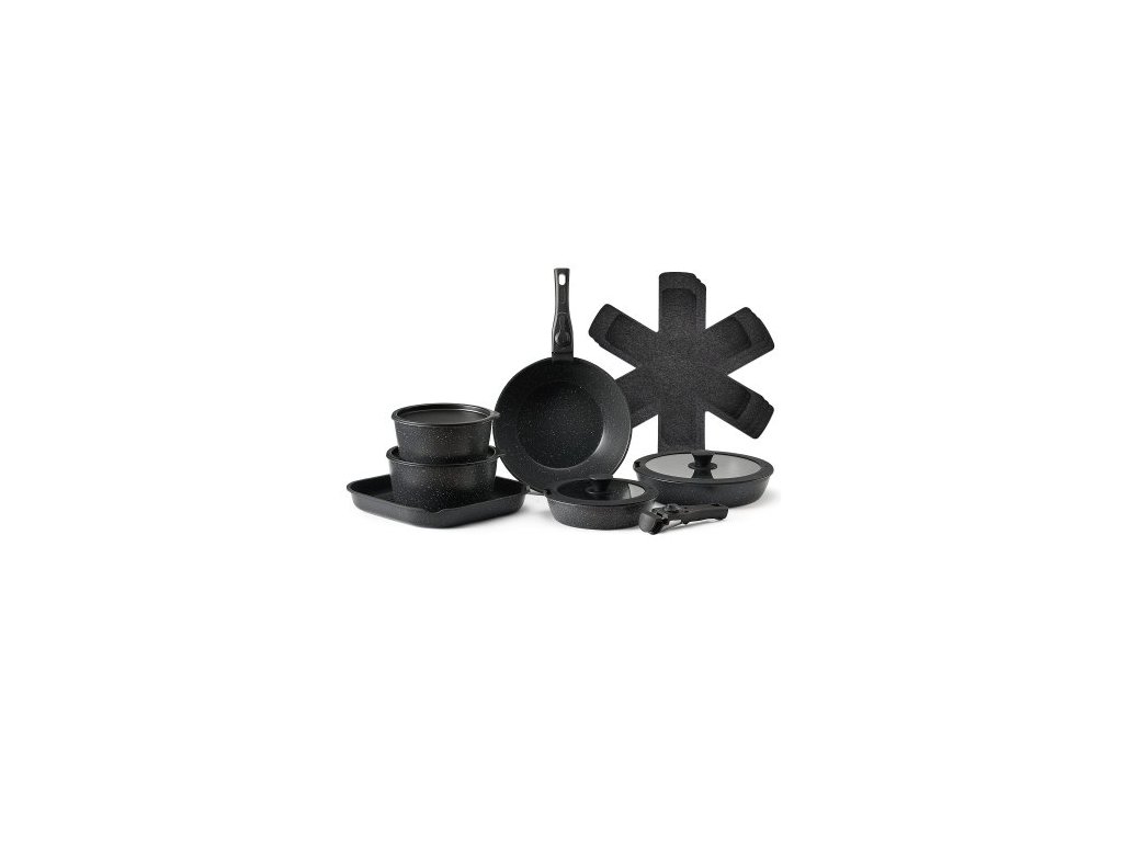 Sada hrnců a pánví VEVOR 17dílná, nádobí s nepřilnavým povrchem a odnímatelnou rukojetí z žuly, indukční nádobí šetří místo, kuchyňské sady pro vaření v karavanu s funkcí smažení, omáčky, restování, poklice z tvrzeného skla, vhodné do trouby, černéVíce kusů v sadě