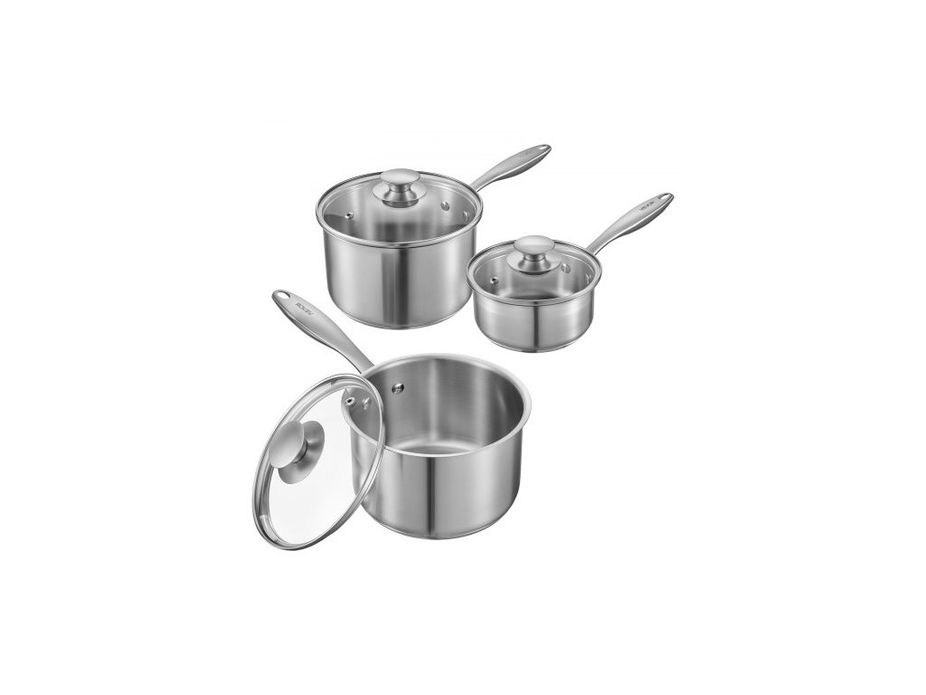Sada hrnců VEVOR z nerezové oceli, hrnce o objemu 1 l, 2 l a 3 l se skleněnými poklicemi, víceúčelový nepřilnavý hrnec z nerezové oceli s ergonomickou rukojetí, vhodný do trouby, myčky nádobí a indukčního vařiče.Víceúčelový hrnec