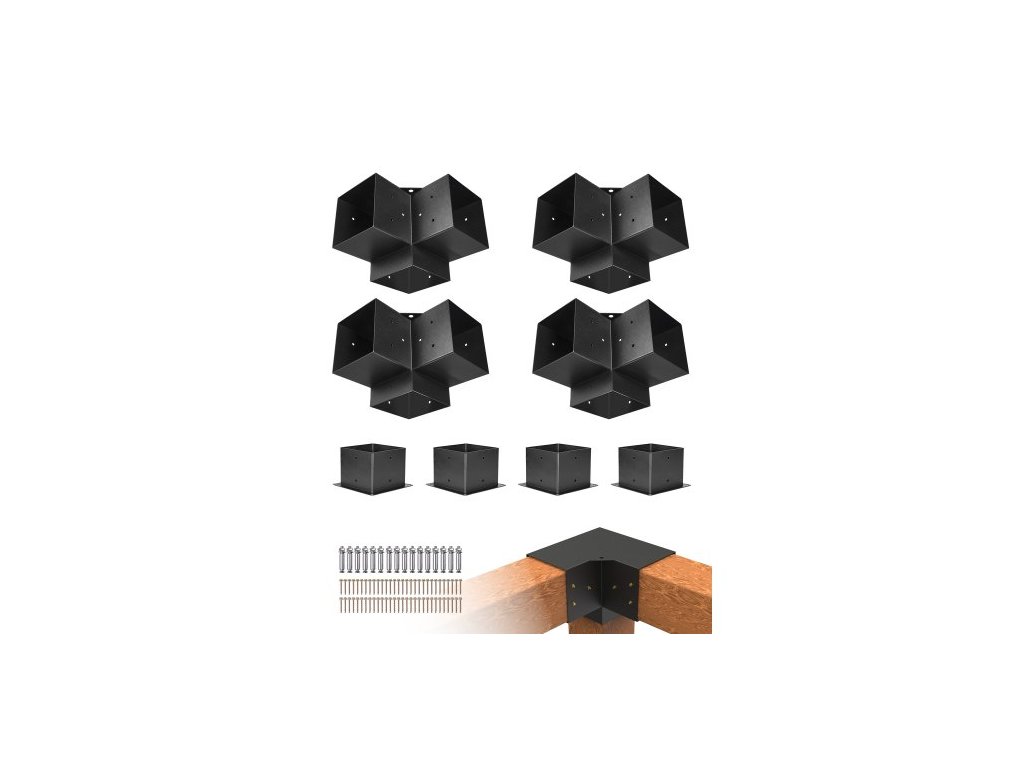 Sada konzolí pro pergolu VEVOR, 6x6 palců (vnitřní rozměr 142 x 142 mm), 4 ks 3cestných robustních rohových konzolí, sada pro výrobu sloupků pro kutily, snadná instalace, dřevěné trámy pro altány, zahradní pergoly, sruby