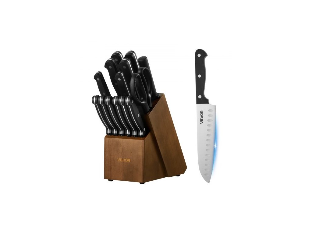 Sada kuchyňských nožů VEVOR s blokem a ořezávátkem, 15dílná sada nožů z německé vysoce uhlíkové nerezové oceli, kuchyňské příbory s ergonomickou rukojetí z ABS, ostřící tyčí a dřevěným blokem, pro domácí kuchařeKompletní sada kuchyňských nožů