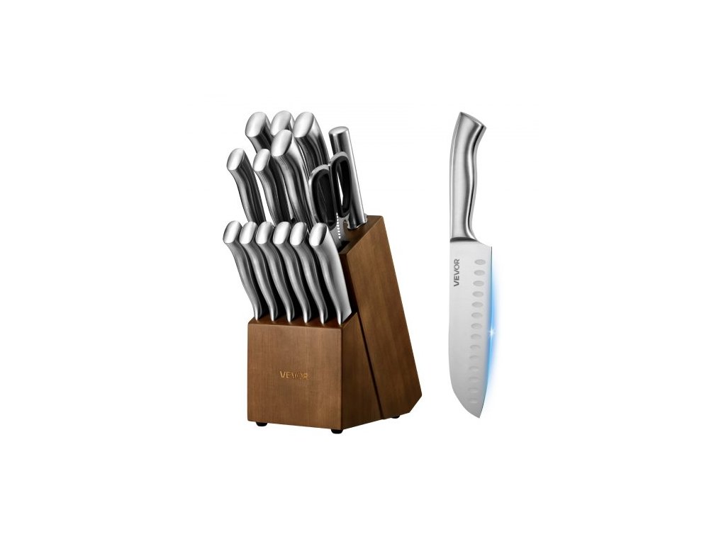 Sada kuchyňských nožů VEVOR s blokem a ořezávátkem, 15dílná sada ostrých nožů z německé vysoce uhlíkové nerezové oceli, kuchyňské příbory s ergonomickou rukojetí, brousící tyčí a dřevěným blokem, pro domácí kuchařeKompletní sada kuchyňských nožů