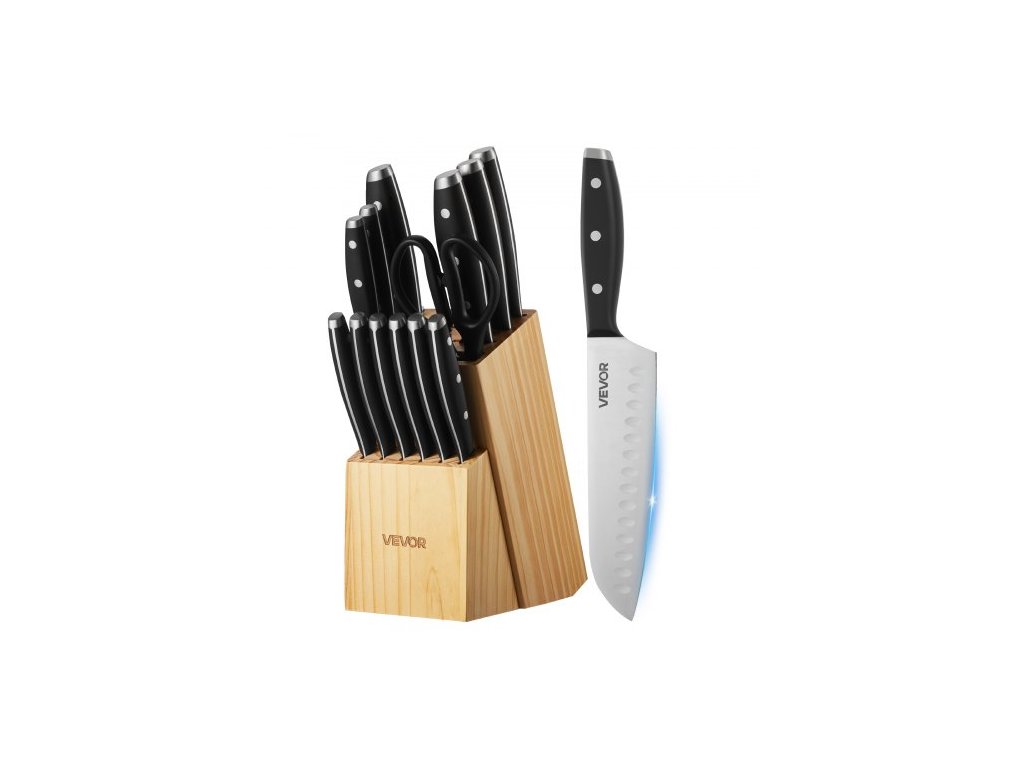 Sada kuchyňských nožů VEVOR s blokem a ořezávátkem, 15dílná sada ostrých nožů z vysoce uhlíkové nerezové oceli, kuchyňské příbory s ergonomickou rukojetí, brousící tyčí a prémiovým dřevěným blokem, pro domácí kuchařeKompletní sada kuchyňských nožů