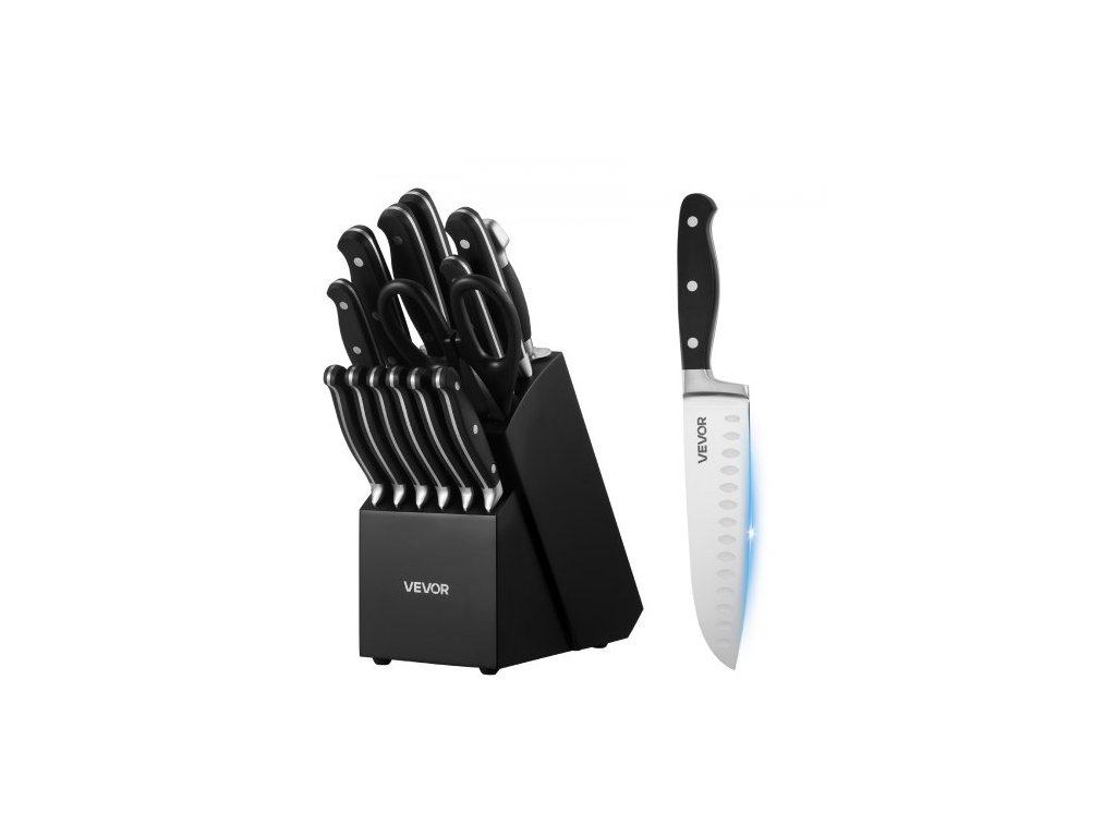 Sada kuchyňských nožů VEVOR s blokem a ořezávátkem, 15dílná sada ostrých nožů z vysoce uhlíkové nerezové oceli, kuchyňské příbory s rukojetí odolnou proti prasklinám, ostřící tyčí a dřevěným blokem, pro domácí kuchařeKompletní sada kuchyňských nožů