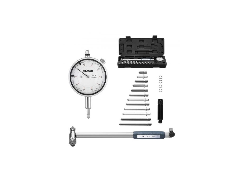 Sada měřicích nástrojů VEVOR s úchylkoměrem a dutinoměrem, úchylkoměr s přesností 0,03 mm, rozsah měření otvorů 50,8–152,4 mm s tyčí, úložným pouzdrem, doteky pro měření v průmyslovém obráběníPřesné měření