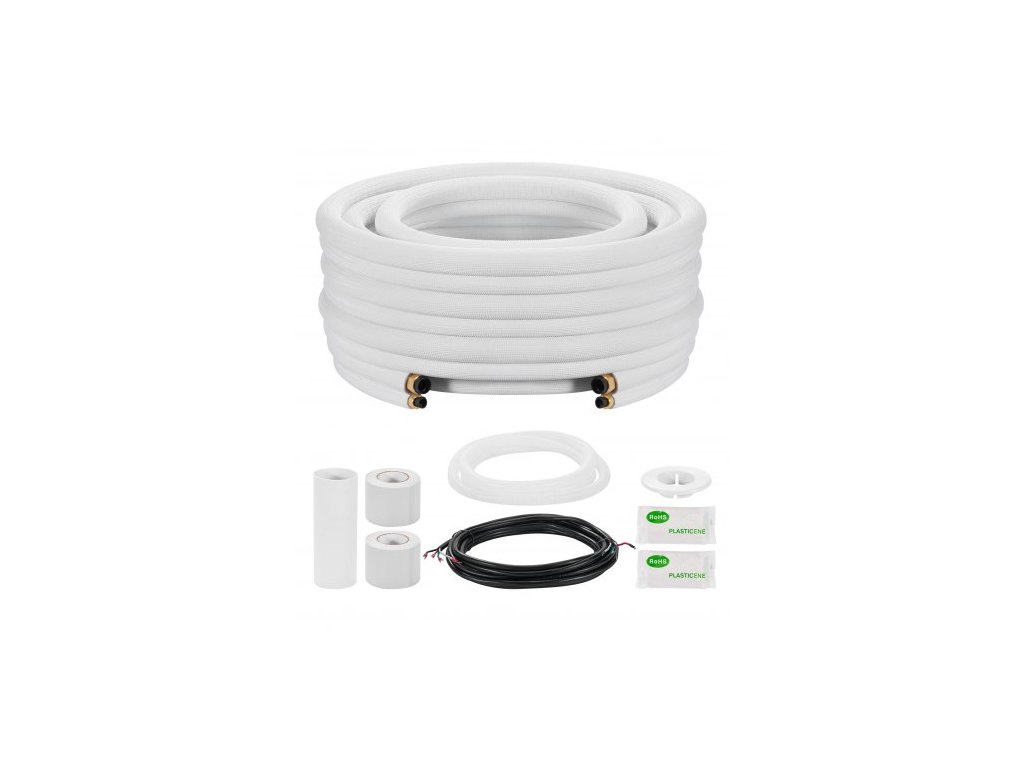 Sada mini splitového potrubí VEVOR 7,6 m, měděné trubky pro střídavý proud o vnějším průměru 9,5 a 15,9 mm, bílá PE zesílená izolovaná spirála 3/8 s rozšířenými maticemi, bohaté fitinky, pro mini split klimatizaci, HVAC nebo tepelné čerpadlo