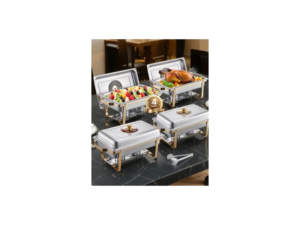 Sada na ohřívání jídla VEVOR Chafing, sada 4 kusů po 8 qt, nerezová ocelová podnosná miska se 4 pánvemi plné velikosti, obdélníkový ohřívač jídla na catering se skleněným víkem, skládací pánev na vodu, držák na palivo, pro svatební hostinu, banket