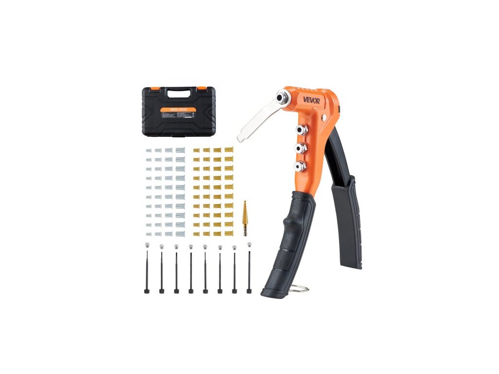 Sada nářadí VEVOR na nýtovací matice, sada nářadí pro jednoruční nýtovací matice 230 mm, s 8 trny, stupňovitým vrtákem a 80 maticemi, metrické a SAE velikosti M3, M4, M5, M6, 6-32, 8-32, 10-24, 1/4-20 UNC, s přepravním pouzdremPřipraveni na vaše opravy a projektové potřeby