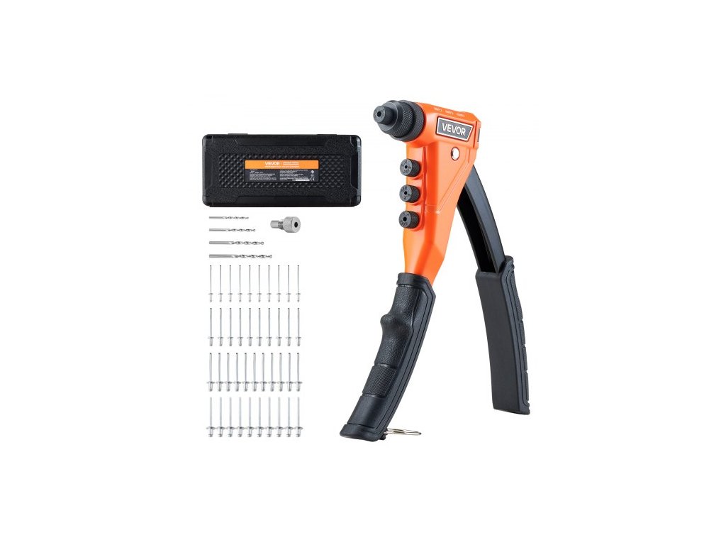 Sada nýtovací pistole VEVOR Pop s 200 slepými nýty, odolná jednoruční nýtovačka se 4 vyměnitelnými nástavci, 4 vrtáky a přepravním pouzdrem, ruční nýtovací nástroj pro kov, automobilový průmysl, domácnostPřipraveni na vaše opravy a projektové potřeby