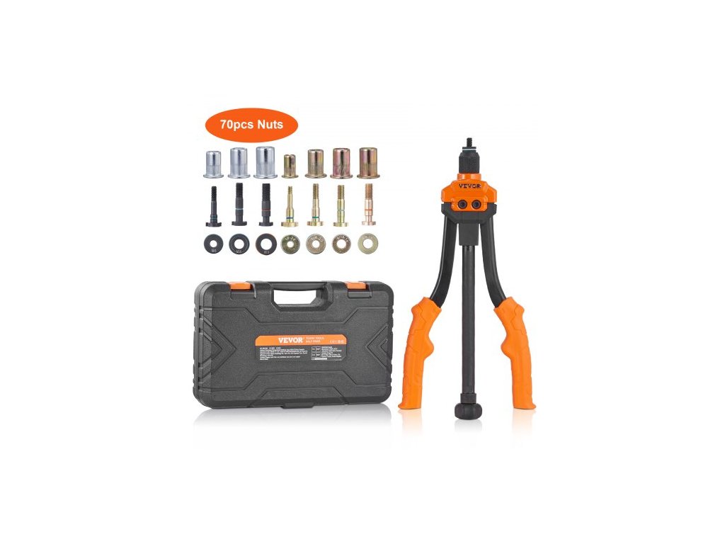 Sada nýtovacích matic VEVOR, 35,6 cm sada nýtovacích nástrojů se 7 díly metrických a SAE trnů, 70 dílů různých nýtových matic, 10-24, 1/4-20, M6, 5/16-18, M8, 3/8-16, M10, sada nýtových matic s robustním přepravním pouzdremEfektivní odnýtování
