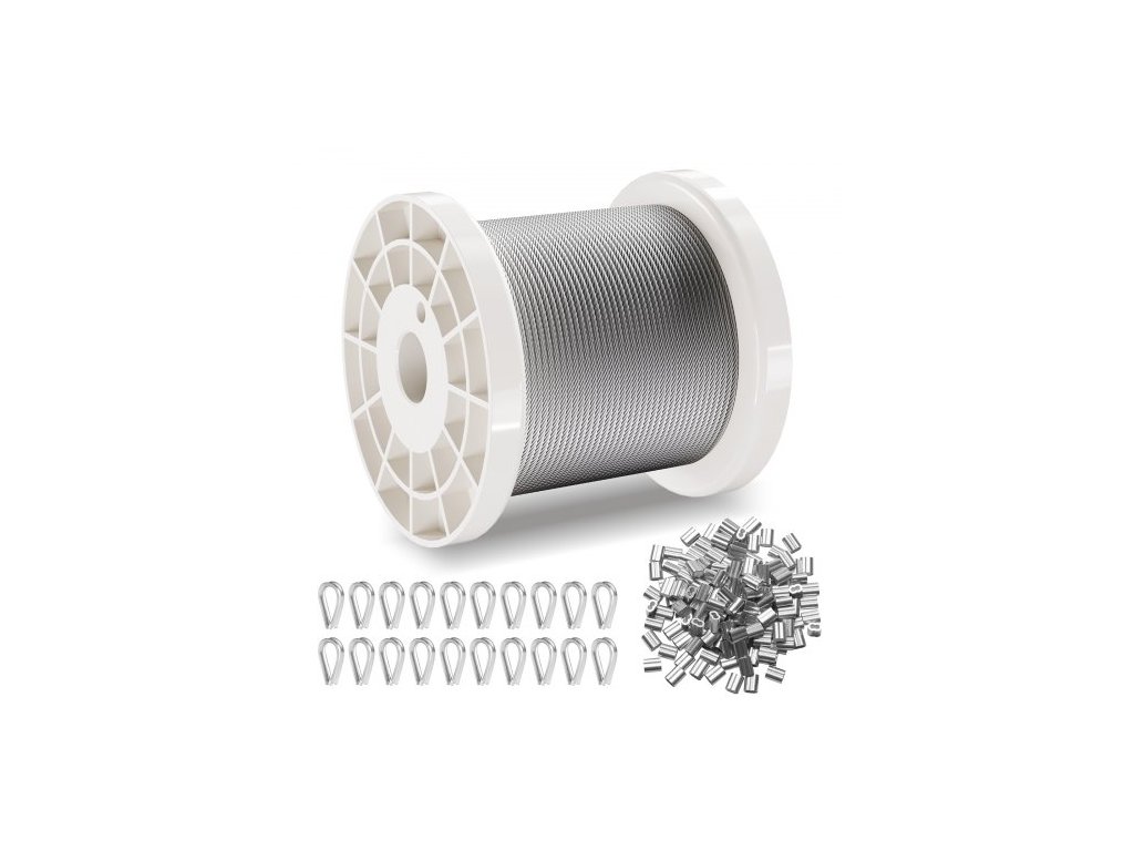 Sada ocelových lan VEVOR, 1/16" 330 ft nerezové lano 304 s 80 návleky a 20 očnicemi, pevnost v tahu 450 lbs, 7x7 pramenů, námořní letecká třída pro zábradlí, schodiště, terasu, plot, venkovní použitíNerezové ocelové lano
