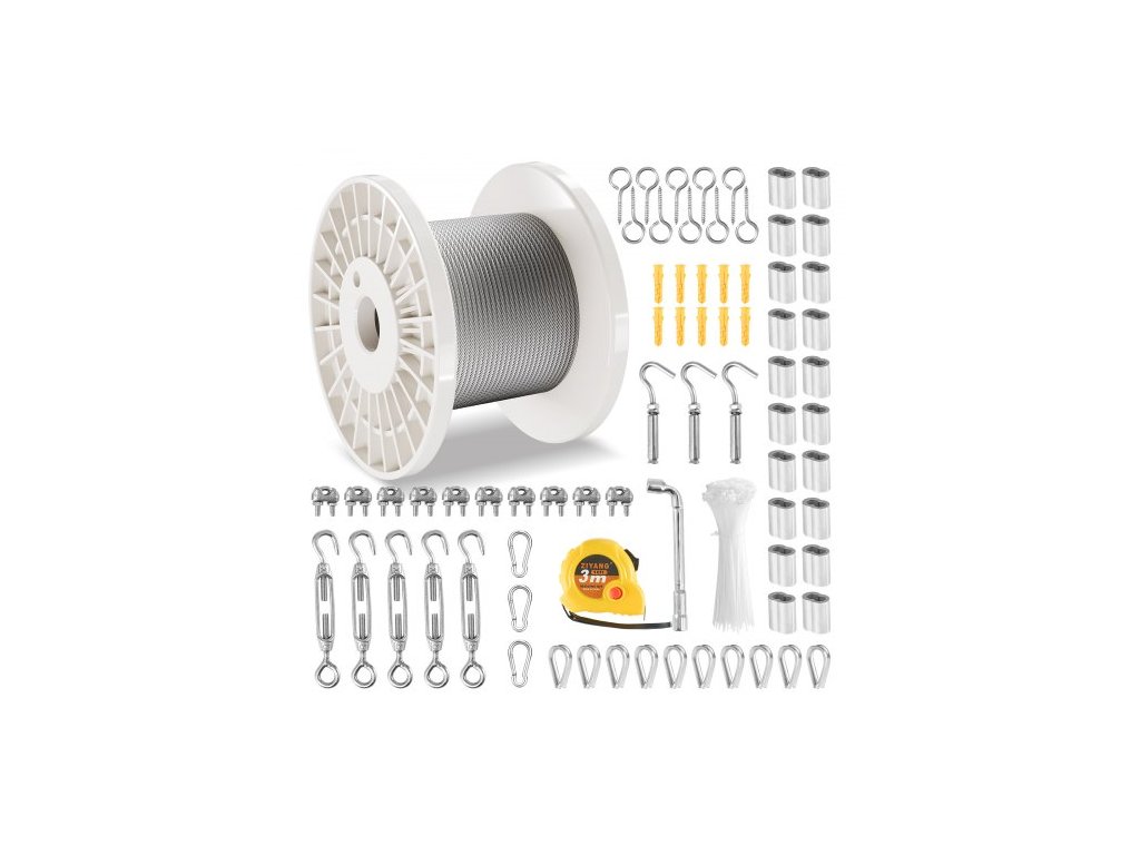 Sada ocelových lan VEVOR, 1/8" 100 ft lano z nerezové oceli 304 se 124 příslušenstvím, pevnost v tahu 1600 lbs, 7x7 pramenů, stavební, námořní, letecká kvalita pro zábradlí, schodiště, terasu, plot, venkovní použití