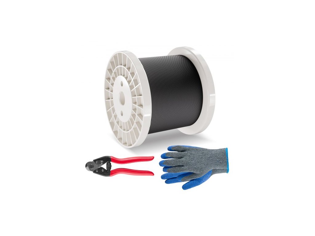 Sada ocelových lan VEVOR, 1/8" 500 ft (152 m) z nerezové oceli 316 s řezacími kleštěmi a rukavicemi, pevnost v tahu 1600 lbs (816 kg), jádro 7x7 pramenů, námořní, letecká kvalita pro zábradlí, schodiště, terasu, plot, venkovní použití, černá